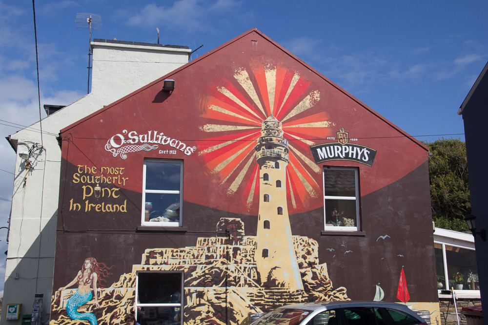Just a few kilometers north of Mizen Head is the little harbor village of Crookhaven where ships would pick up provisions for their transatlantic journey. The harbor has several pubs and restaurants and I had a wonderful seafood chowder outside of O’Sullivan’s Pub, described as home of the ‘most southern PINT in Ireland.’
